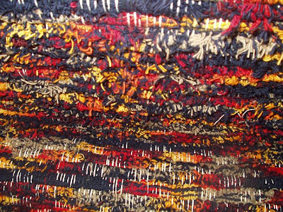 New tablecloth from Adivasi. They have a web site, so try "dot com". This sweet piece is 90x108. The colors are deeper but the morning sun gives us this color perspective. The hand thrown been pot was made by Hunter Neil, a new friend of ours. The colors go so well together.I opened the closet in the loom room yesterday and rediscovered two boxes and one bag of Pendelton wool selvages I bought about 10 years ago. I wove my first rug using the worms and though the animals like the rug I'm not that crazy about the shag rug look. Well, not being one to waste "product", I pulled out the selvages and wove this at the end of a run of rugs.